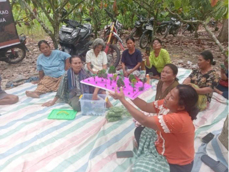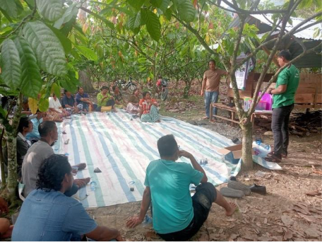 The group training process took place in a model cocoa farm (demofarm) and was attended by producers from Lawe Kulok village. The session highlighted the active participation of women producers, who presented their farm designs using the DCA (Diversified Cocoa Agroforestry) model mock-ups.